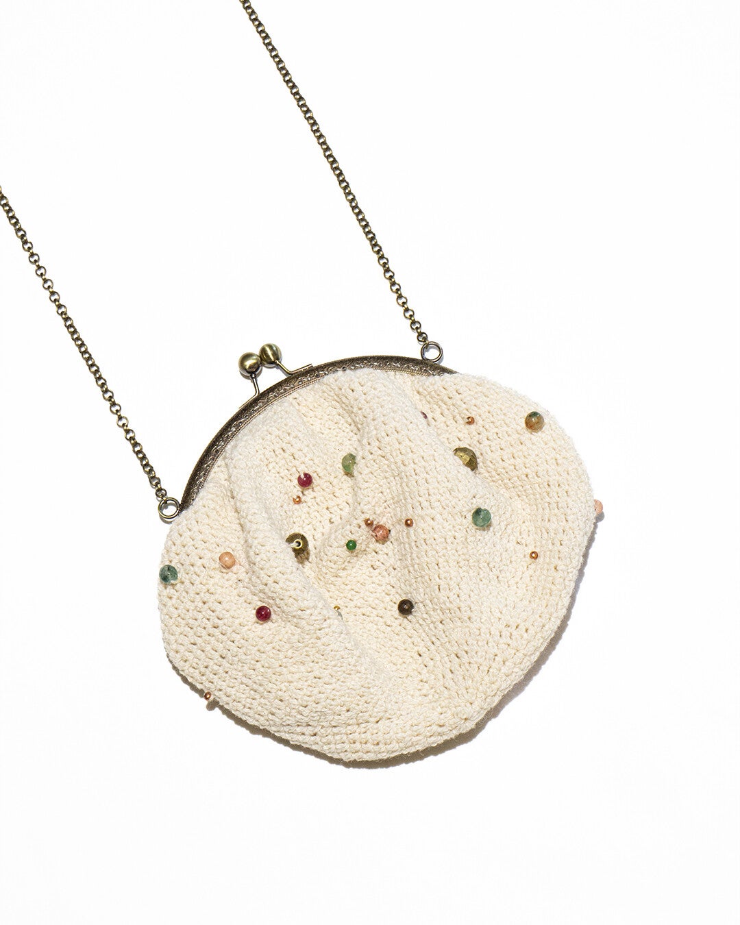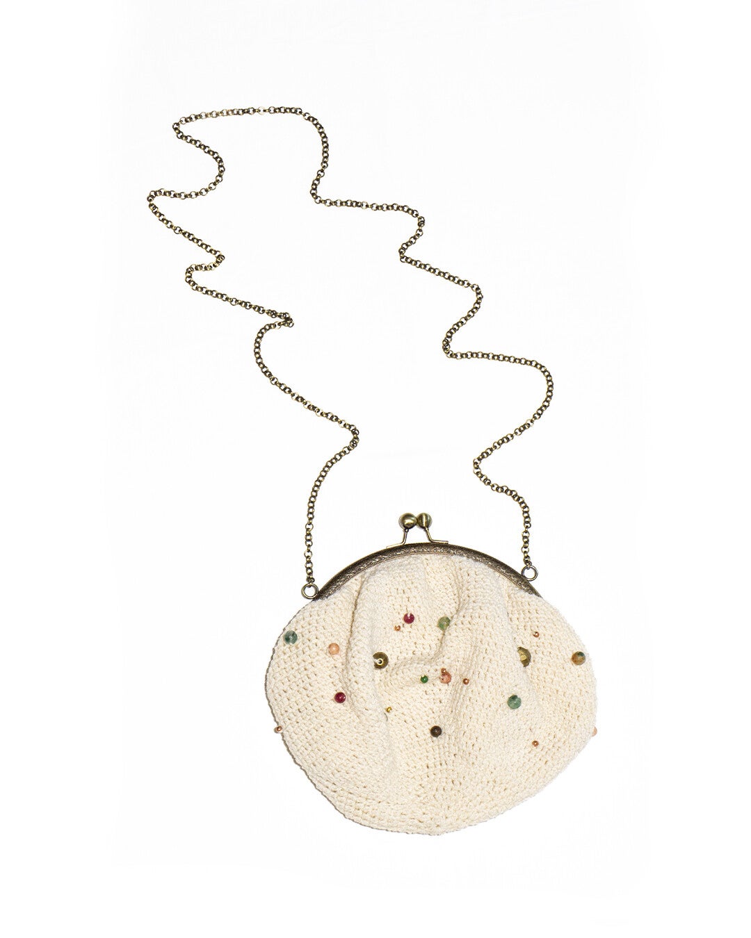 Borsetta in pura lana abruzzese tempestata di pietre naturali, con tracolla. Realizzata all'uncinetto